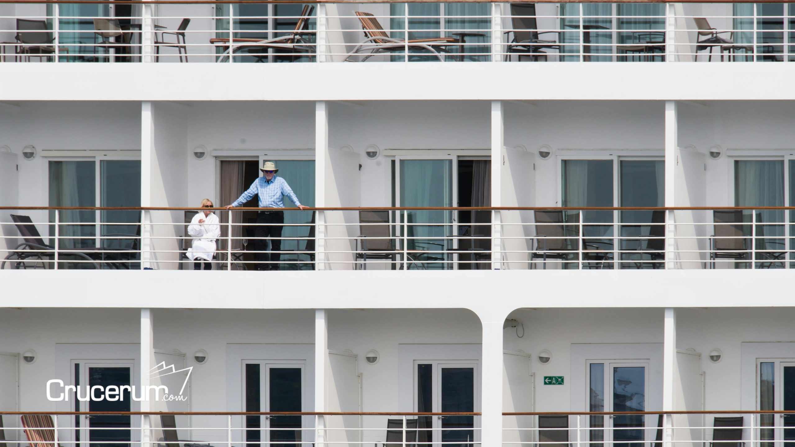 costa del barco vista de las habitaciones hombre de pie en el balcón mujer descansa en tumbona cruceros 2026